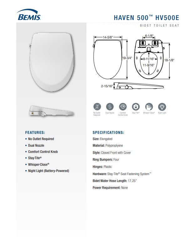 Experience the powerful clean and stylish simplicity of the Bemis Haven 500—a bidet seat with top-notch performance that seamlessly blends into any bathroom with its slim design. The Haven 500 is equipped with quality features including a night light, dual nozzle, and a dual wash function. The ease of operation is at your fingertips with the intuitive comfort control knob. Designed for your convenience, the Bemis Haven 500 is equipped with Stay·Tite Seat Fastening System technology, ensuring a hassle-free installation process and a seat that remains securely in place. Elevate your bathroom experience with the perfect combination of design and functionality.