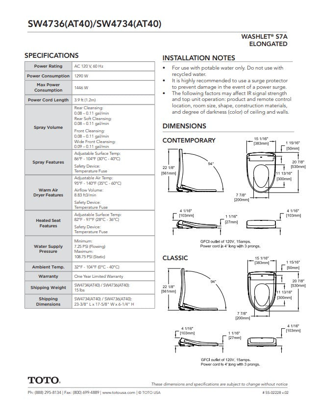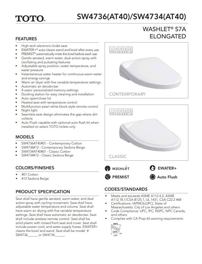 SW4734AT40#01 - WASHLET® S7A - Classic - Elongated with ewater+